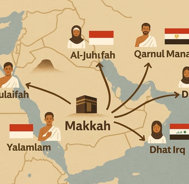 ๐ Apa Itu Miqat? Dalam ibadah Haji dan Umrah, Miqat adalah batas tempat atau waktu tertentu yang telah ditentukan oleh Rasulullah ๏ทบ sebagai titik dimulainya niat ihram. Seorang jamaah tidak boleh melewati Miqat menuju Makkah tanpa terlebih dahulu berniat ihram dan memasuki keadaan suci (ihram).