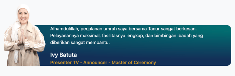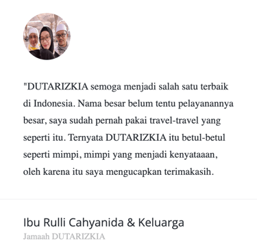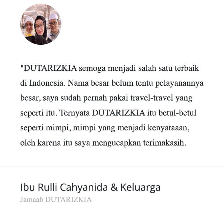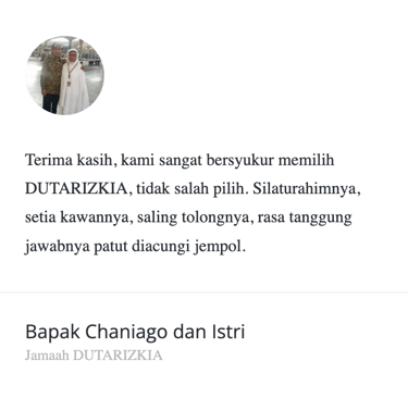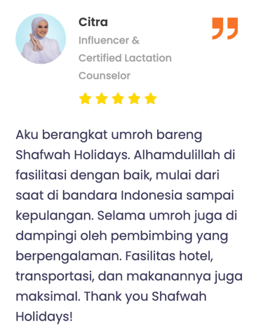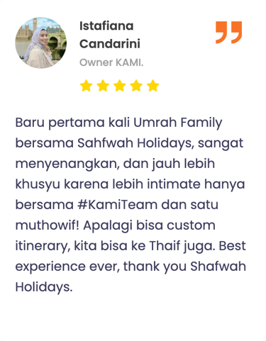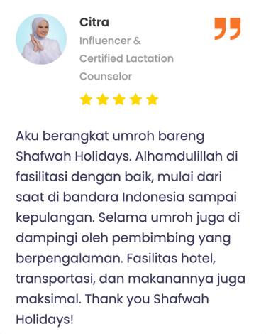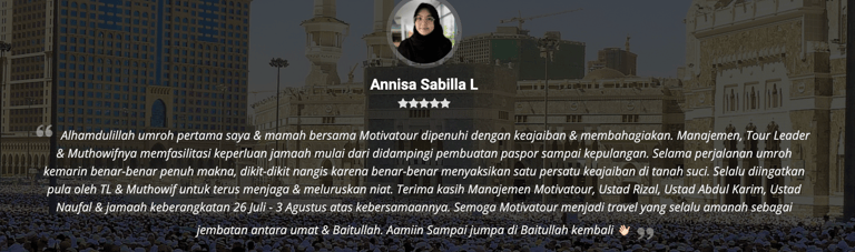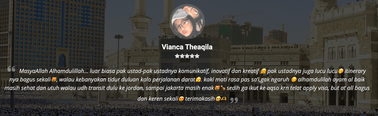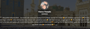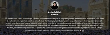 "Masyaa Allaah, staf sangat komunikatif, penanganan handling jg perfecto, muthowif oks banggets, pak ustd jg bisa memberi nilai tambah dlm perjalananan,senang rasanya dg pengalaman ini… alhamdulillaah."