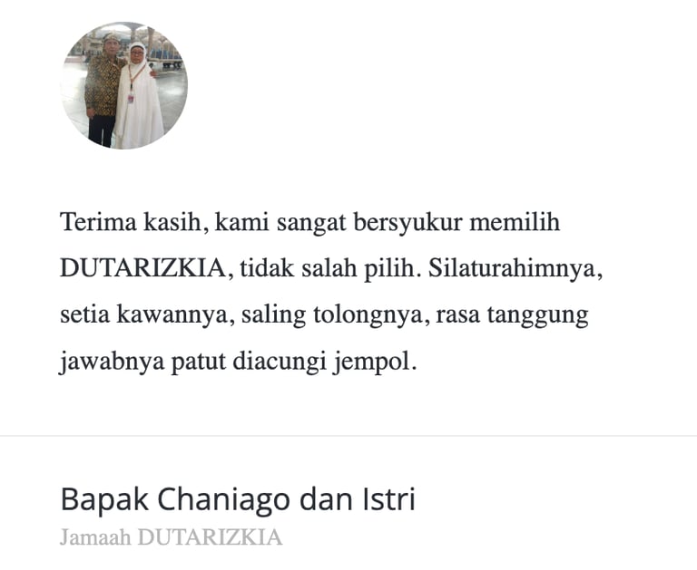 Alhamdulillah..terkait ibadah umrah kami yang pertama ini segala kemudahan kami dapatkan dari PT. DAUROH Travel, banyak pelayanan yg melebihin apa yang sudah kami bayangkan sebelumnya berdasarkan cerita dari team/saudara yang pernah melakukan perjalanan (maaf) bersama vendor lain. Semoga diwaktu mendatang service dari PT. DAUROH Travel semakin bertambah bagus & semoga bisa kembali bersama kembali untuk menjalankan ibadahnya. Aamiin.. Jazakumullah Khairan Katsiran untuk semua yang sudah diberikan pada kami.